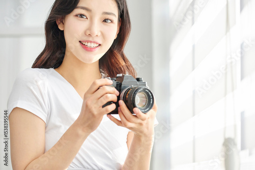 © Dialogue Frame, Fototapeta premium Young Asian Woman Photographer in White T-Shirt Holding Vintage Camera by Bright Window Indoors
