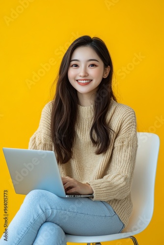 © Anatoll Paveel, Naklejka premium Young Asian woman smiling happy. While she is using a laptop, sitting on a white chair and looking isolated on a yellow copy space background.