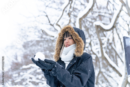 Obraz premium Young Asian woman traveler enjoy outdoor lifestyle travel nature forest mountain in winter snow season on holiday vacation. Attractive girl holding snowball with looking beautiful nature in snow day.