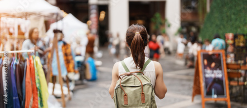 © Jo Panuwat D, Naklejka premium Young asian woman traveler in Yellow dress with bag traveling to NIMMAN on Nimmanhaemin Road, Tourist visit at the Night market city in Chang Mai, Thailand. Asia Travel, Vacation and summer holiday