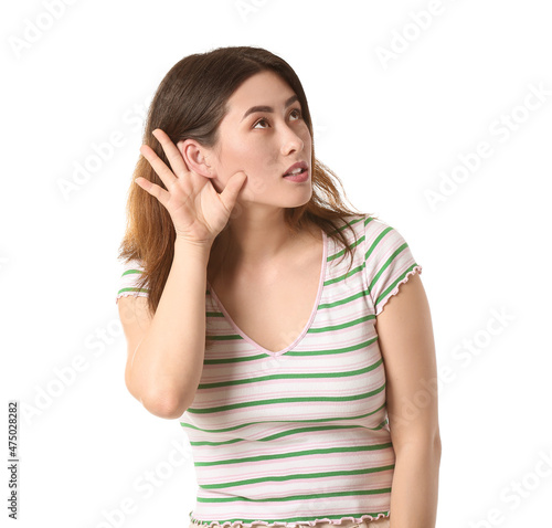 Fototapeta premium Young Asian woman trying to hear something on white background