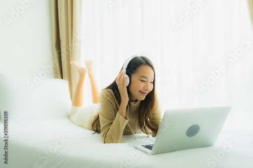 Fototapeta premium Young asian woman using laptop with headphone for listen music