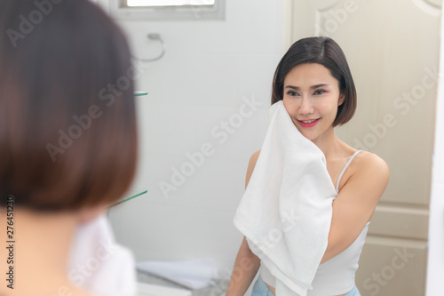 Fototapeta premium Young asian woman wiping her face with towel in bathroom.