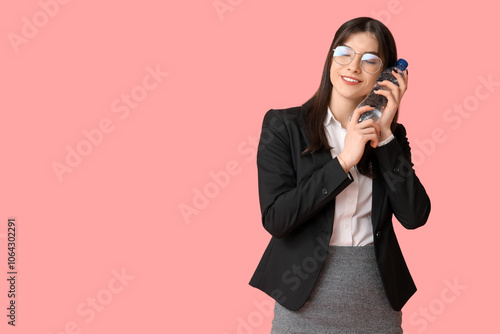 © Pixel-Shot, Obraz premium Young Asian woman with bottle of water on pink background