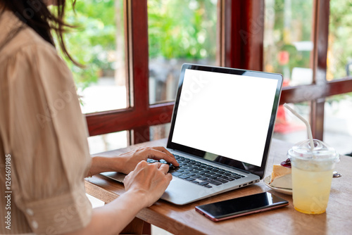 © Kittiphan, Fototapeta premium Young Asian woman with drinks working with laptop in cafe, Digital nomad lifestyle