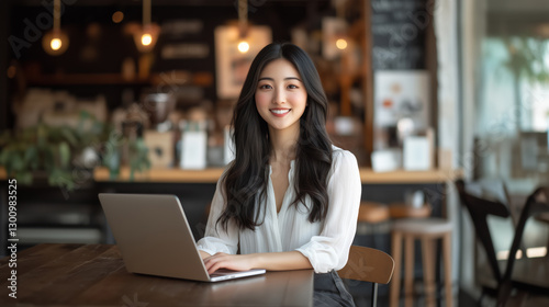 © BrightSpace, Fototapeta premium young Asian woman with long hair is sitting at wooden table in cozy cafe, smiling while using laptop. warm lighting and blurred background create welcoming atmosphere