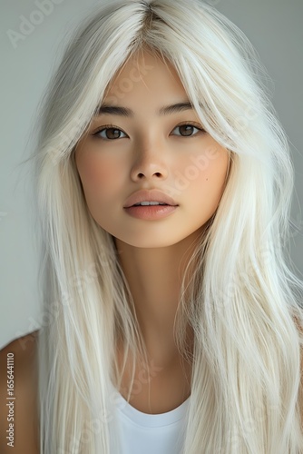 © Yuliia, Fototapeta premium Young Asian woman with platinum blonde hair and natural makeup wearing white tank top against light background, soft studio lighting creates gentle shadows.