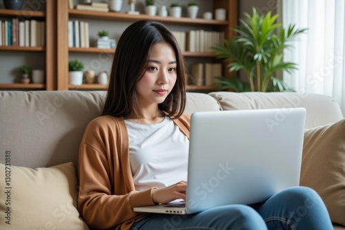 © SimpleDesignStudio, Naklejka premium Young Asian Woman Working on Laptop at Home in Cozy Living Room Surrounded by Plants and Bookshelves During Daytime