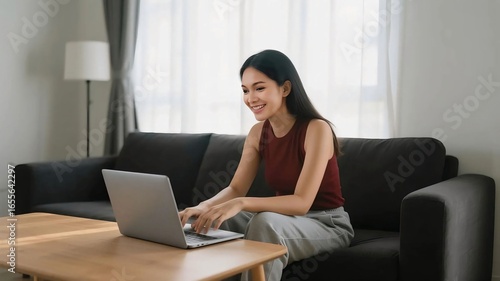 © onyengradar, Naklejka premium Young Asian woman working on laptop at home while sitting on sofa in cozy living room