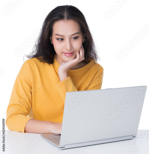 Naklejka premium Young Asian woman working on laptop she wearing a yellow sweater shot isolated on white background