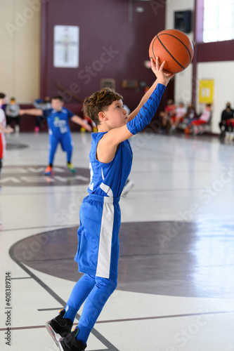 © Joe, Fototapeta premium Young athletic boy playing in a game of basketball