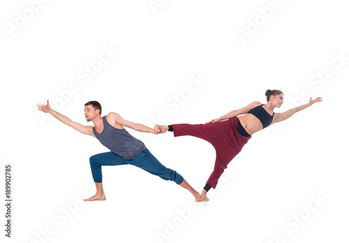 © lenets_tan, Obraz premium Young athletic couple practicing acroyoga. Balancing in pair
