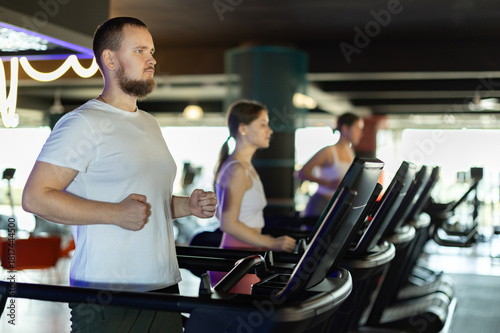 Obraz premium Young athletic man in sportswear training by running on treadmill in gym