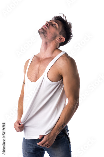 Fototapeta premium Young athletic man pulling down tanktop
