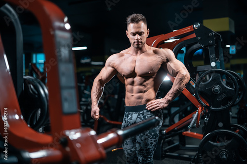 Naklejka premium young athletic sportsman bodybuilder with muscle perfect body posing in gym