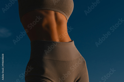 Fototapeta premium Young athletic woman's abs closeup against blue sky background