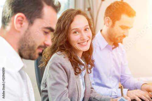 Fototapeta premium Young attractive businesswoman working at the office with associ