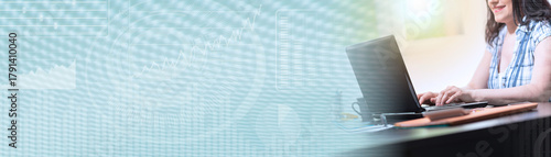 © thodonal, Fototapeta premium Young attractive businesswoman working on laptop, light effect; panoramic banner