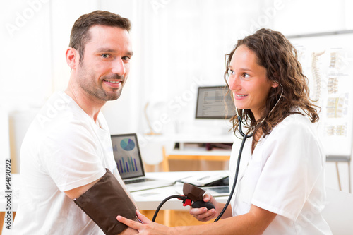 © Production Perig, Obraz premium Young attractive doctor checking patient's blood pressure