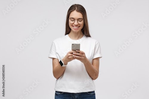 Fototapeta premium Young attractive european female with smartphone in hands, isolated on gray...