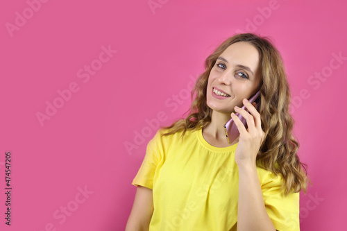 Fototapeta premium Young attractive girl talking on phone on a pink background