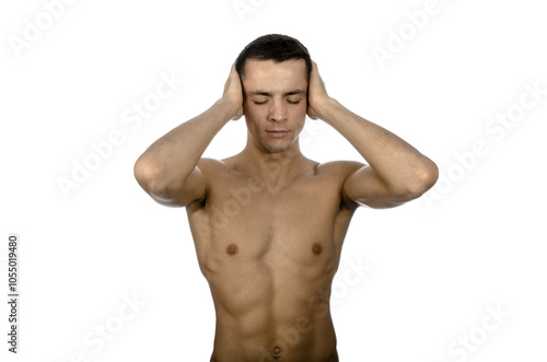 Fototapeta premium Young attractive man with athletic body posing in studio.
