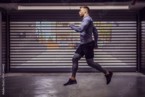 Fototapeta premium Young attractive muscular sportsman running in underground garage.
