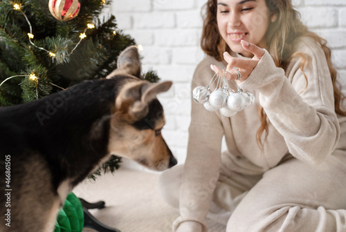 Obraz premium young attractive woman decorating the Christmas tree and playing with dogs