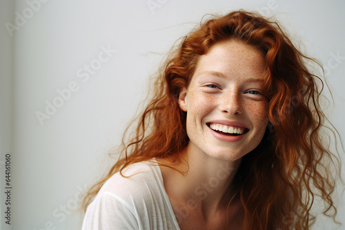 © deagreez, Fototapeta premium Young attractive woman isolated over background nice hair curls Generative AI technology