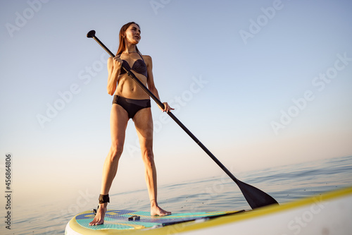 Fototapeta premium Young attractive woman standing on paddle board