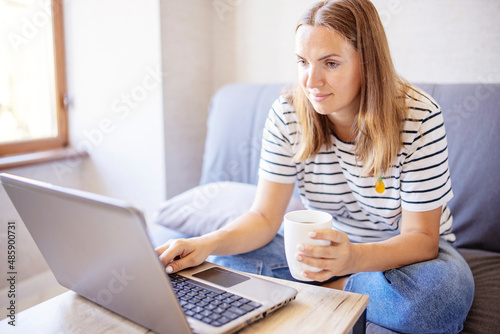 © spyrakot, Naklejka premium Young attractive woman using laptop computer and drinking morning cup of coffee while wearing a jeans and t-shirt. Brunette female sitting in a living room. Freelancer working from home
