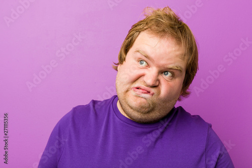 © Asier, Obraz premium Young authentic redhead fat man frowning face in displeasure, keeps arms folded.