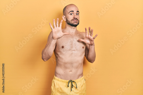Fototapeta premium Young bald man wearing swimwear afraid and terrified with fear expression stop gesture with hands, shouting in shock. panic concept.