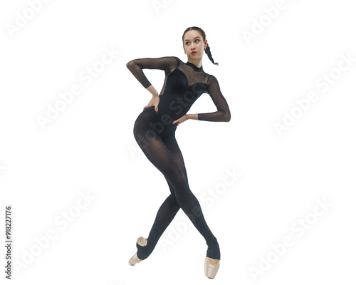 Obraz premium young ballerina in a black leotard shows the eversion of her feet with her hands on her belt, young ballerina in a black leotard shows the eversion of her feet with her hands on her belt, isolated on