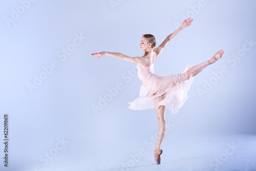 © Designpics, Obraz premium Young ballerina is dancing in a white studio full of light