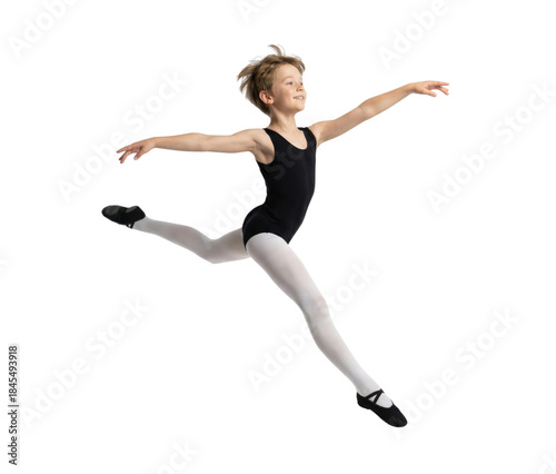 Fototapeta premium Young ballet dancer leaping in black leotard on white background