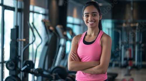 Obraz premium Young Bangladeshi Female Fitness Trainer in Gym with Exercise Equipment for Health and Wellness