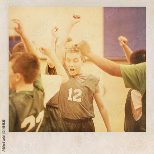 © soupstock, Naklejka premium Young basketball player cheering with his team. Vintage grunge