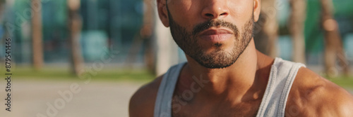© Andrii Nekrasov, Fototapeta premium Young bearded male athlete is resting after training sitting on bench on modern background, close up, panorama