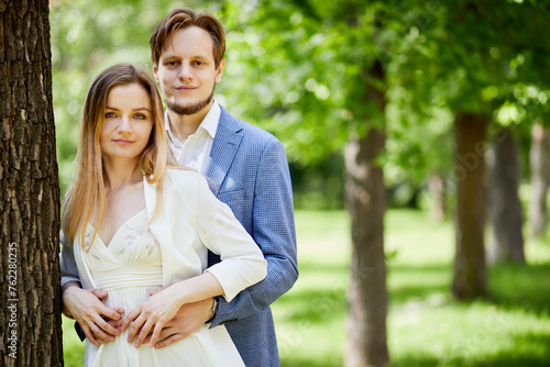 © Pavel Losevsky, Fototapeta premium Young bearded man and woman stand ebracing at big tree trunk in park.