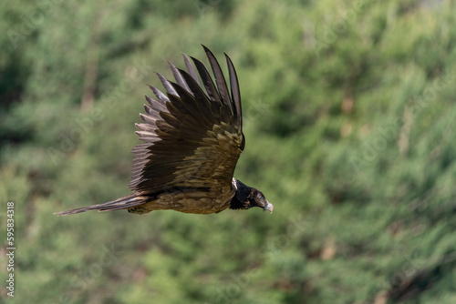 Obraz premium Young Bearded Vulture in flight with out-of-focus forest background