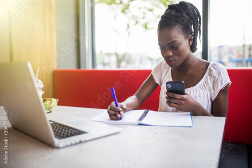 Fototapeta premium Young beautiful Afro-American woman using laptop and writing in notebook while studying in cafe