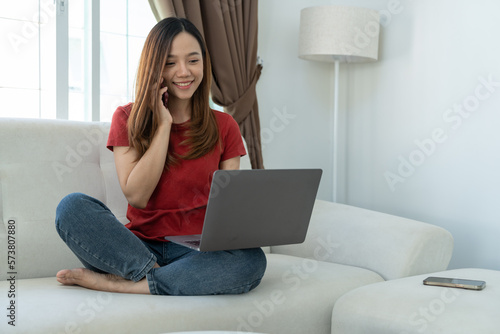 Naklejka premium Young beautiful asian woman using laptop computer and mobile phone on sofa at...