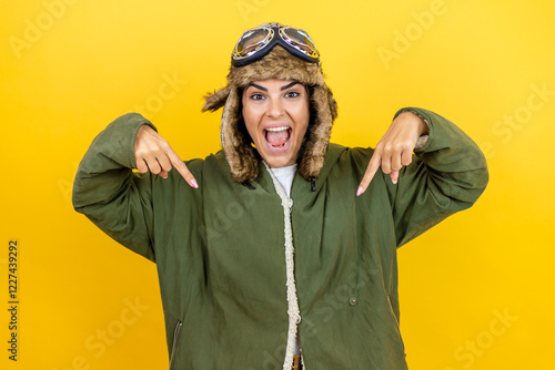 © Irene, Fototapeta premium Young beautiful aviator woman wearing vintage pilot helmet with glasses and jacket over yellow background looking confident with smile on face, pointing oneself with fingers proud and happy.