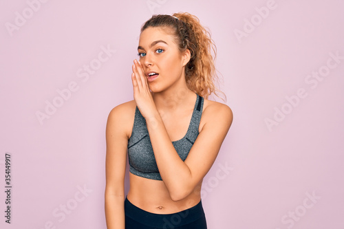 Fototapeta premium Young beautiful blonde sportswoman with blue eyes doing exercise wearing sportswear hand on mouth telling secret rumor, whispering malicious talk conversation