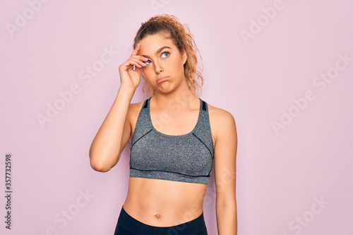 Fototapeta premium Young beautiful blonde sportswoman with blue eyes doing exercise wearing sportswear worried and stressed about a problem with hand on forehead, nervous and anxious for crisis