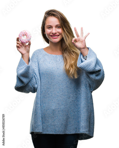 © Krakenimages.com, Obraz premium Young beautiful blonde woman eating sweet donut over isolated background doing ok sign with fingers, excellent symbol