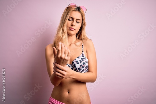© Krakenimages.com, Naklejka premium Young beautiful blonde woman on vacation wearing bikini over isolated pink background Suffering pain on hands and fingers, arthritis inflammation