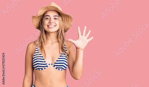 Naklejka premium Young beautiful blonde woman wearing bikini and hat showing and pointing up with fingers number five while smiling confident and happy.