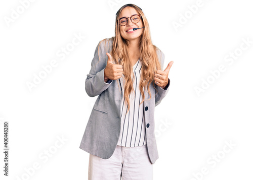 Obraz premium Young beautiful blonde woman wearing call center agent headset success sign doing positive gesture with hand, thumbs up smiling and happy. cheerful expression and winner gesture.